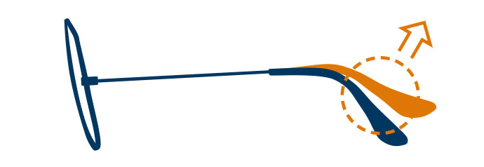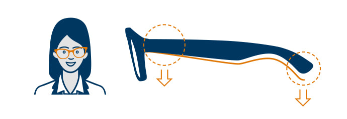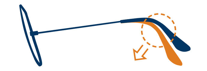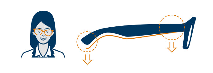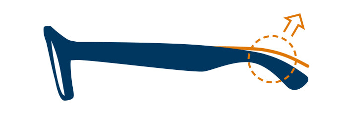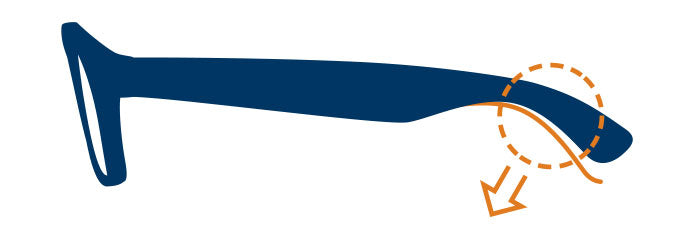 In this case, bend the left arm of your frames down gently at the hinge or at the bend that follows your ear. Bend the arm down where it feels easiest to do so. (Before adjusting, use your hair dryer to heat the arm for approx 30 sec).