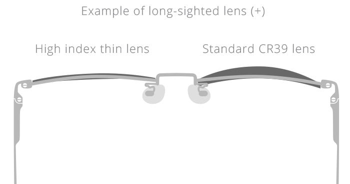The higher the power in your prescription, the thicker the lenses. This is where thinner (High index plastic) lenses are a better choice. High index lenses can bend light more efficiently than the standard lenses. This means, less lens material is needed to correct the prescription. This makes the lens thinner and therefore lighter too. The higher the refractive index, the thinner the lenses.